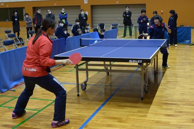 講演の後はミニクリニック。中学3年生と抽選で選ばれた1・2年生は、平野さんからラリーを通じてアドバイスをもらいました。オリンピックメダリストとの貴重な体験です!