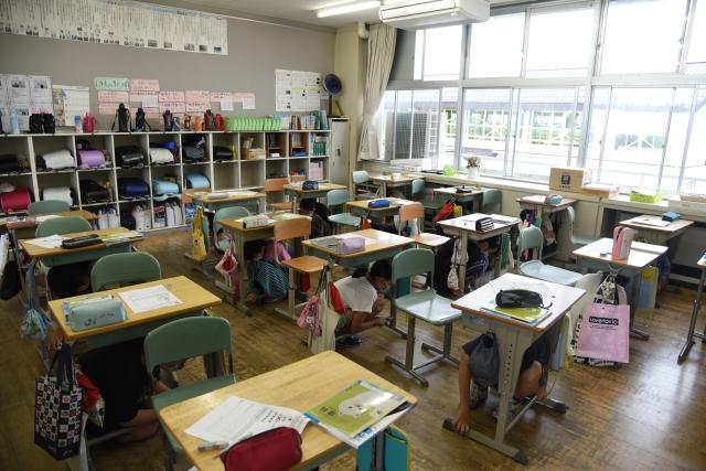 地震から身を守る方法を身に付けるため、市内小中学校ではシェイクアウト訓練が行われています。