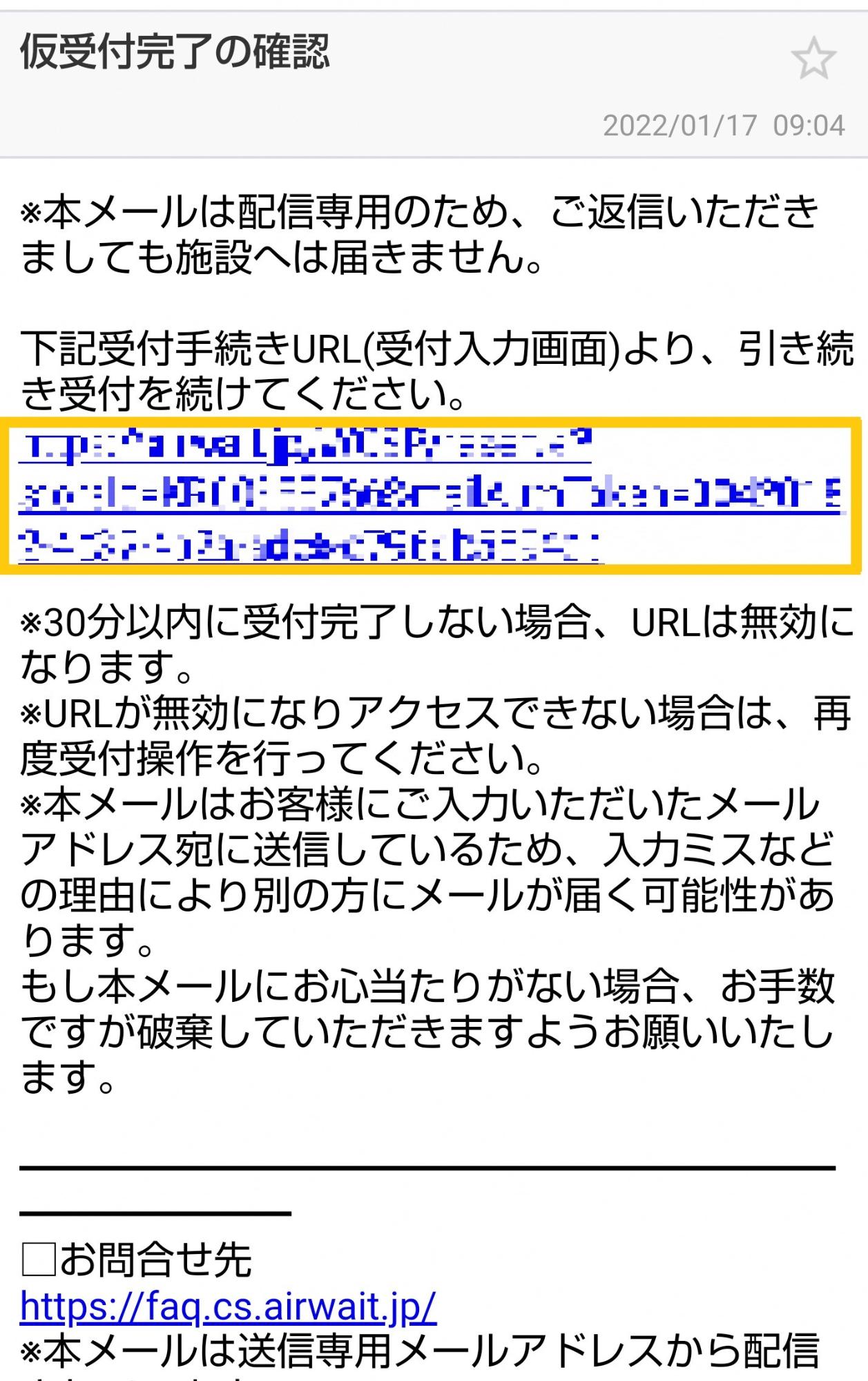 | 4 | 仮受付完了メールが届いたら、メール本文のURLをタッチし、受付サイトへ移動します。 | ![]() |