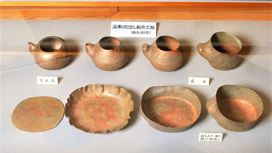 一枚の銅板から職人の手によって打ち出される銅器は、使えば使うほど手になじみ、味わいのある光沢を帯びてくる。工房では、制作過程を目の前で見学できる。