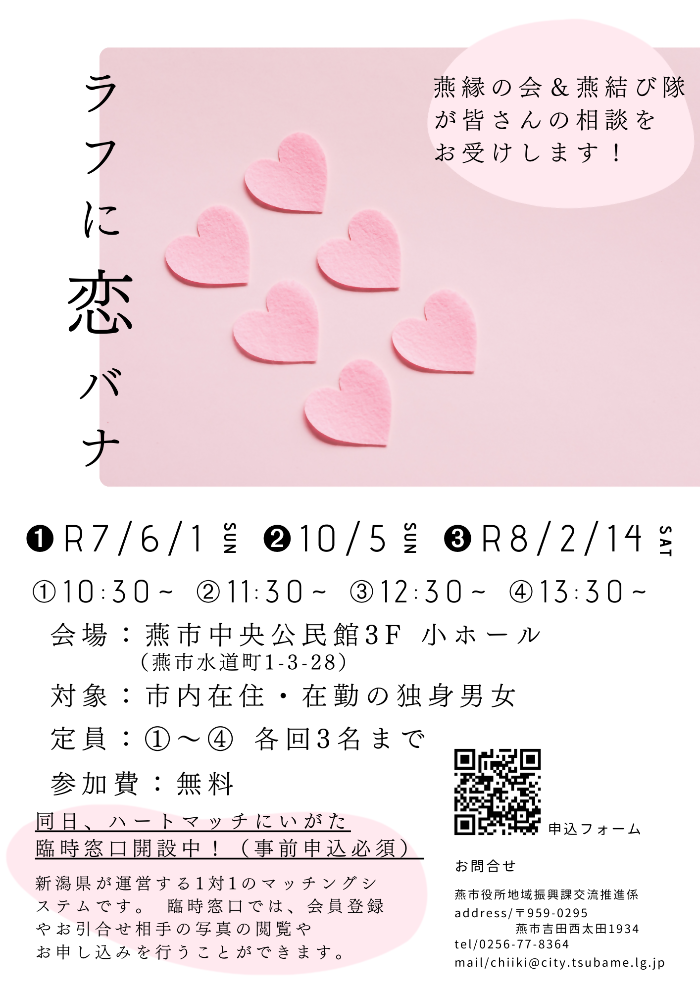 燕市では、結婚を希望する独身男女を対象とした結婚相談会『ラフに恋バナ』を燕市中央公民館で開催します。第3回は、2月14日(土曜日)!