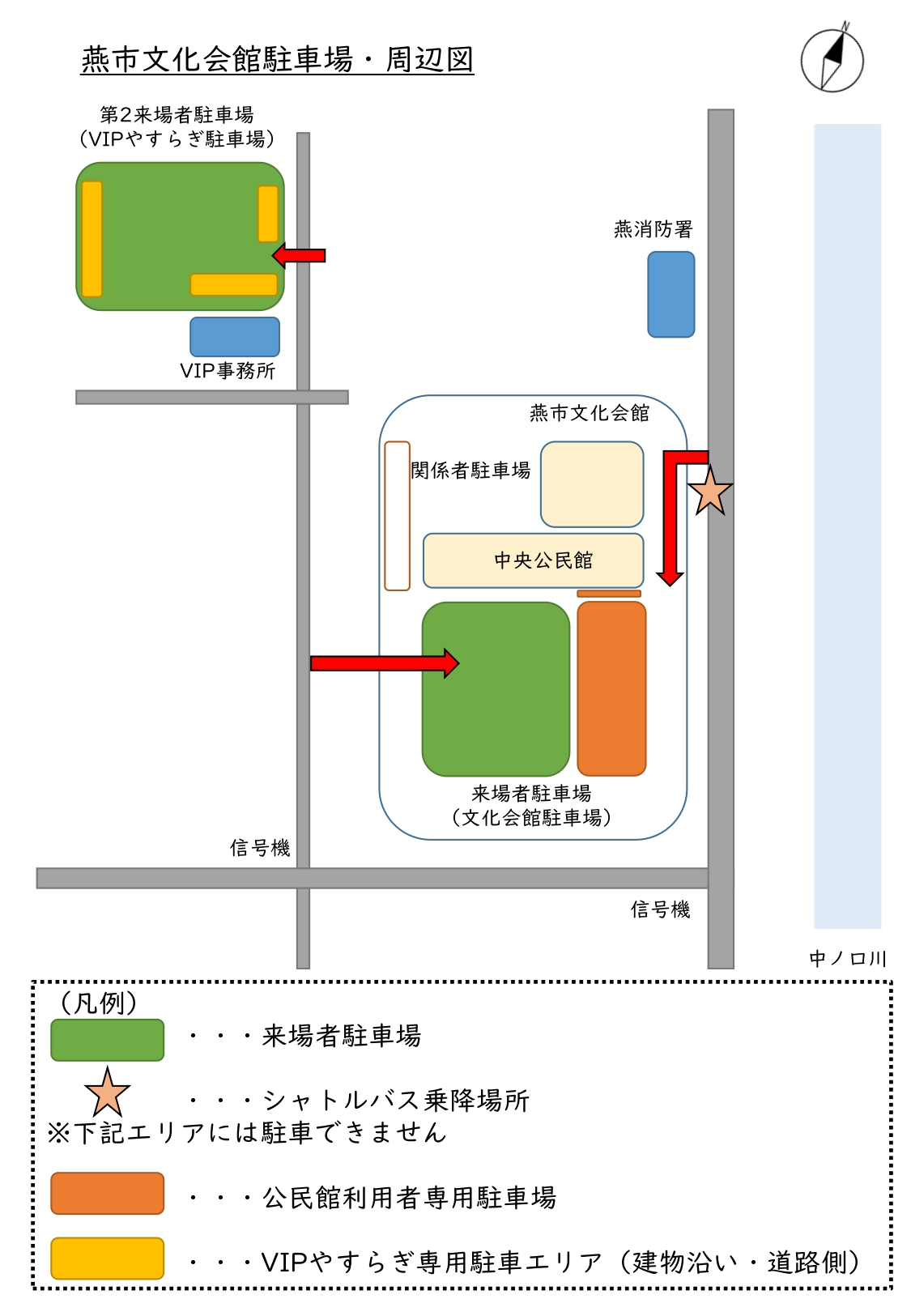 ・文化会館の駐車場が満車の場合は、近接の臨時駐車場をご案内いたします。警備員の誘導に従って駐車してください。