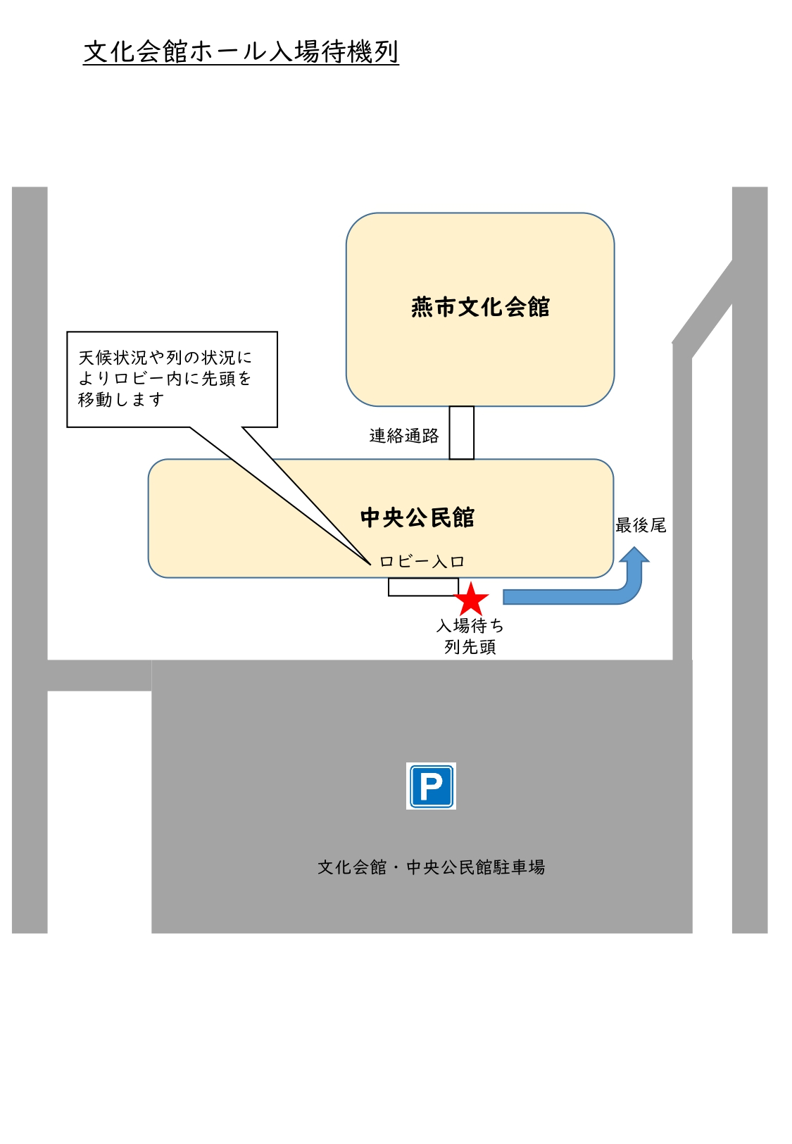 ・待機列の先頭は公民館の入口付近に設置します。当日の天候状況に応じて公民館ロビー内に移動する場合があります。