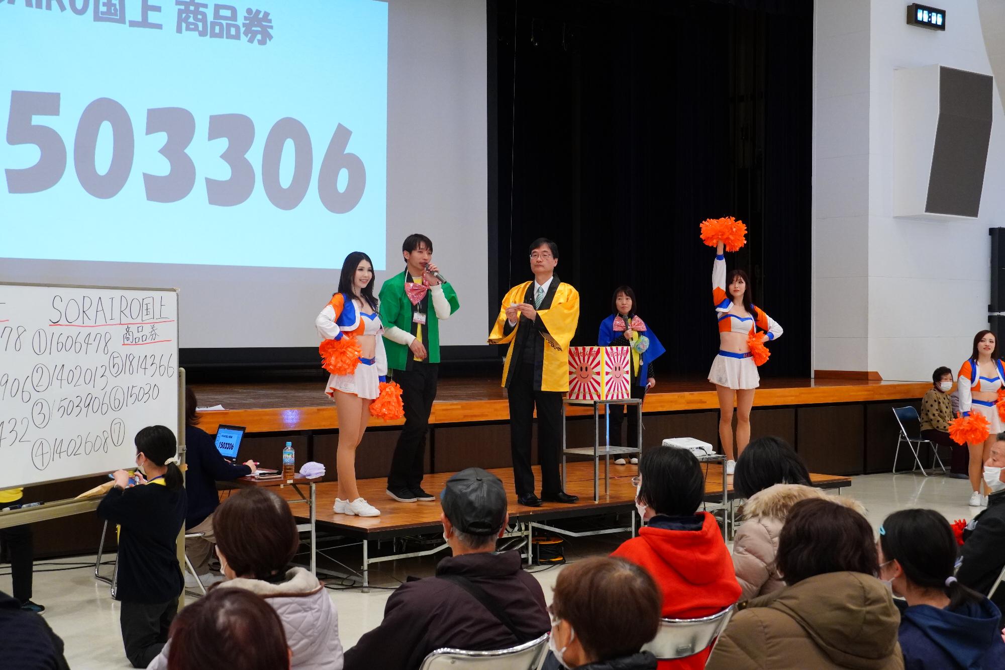 式典終了後に行われたアトラクションでは実行委員会の進行で大抽選会が行われ、旅行券をはじめとする豪華景品に、会場はドキドキワクワク。
