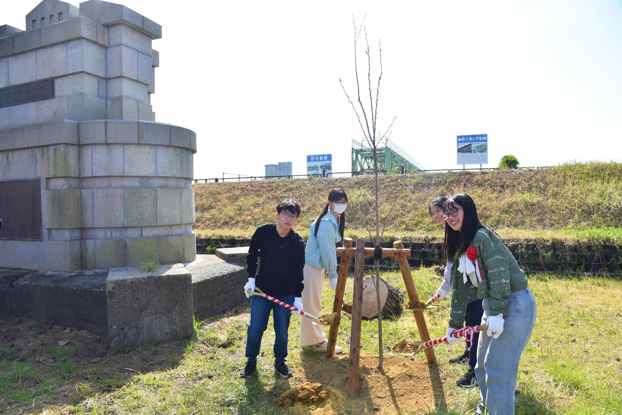 続いて、植樹式。今年は信濃川補修工事竣工を記念して建立された石碑の隣に2本植樹しました。