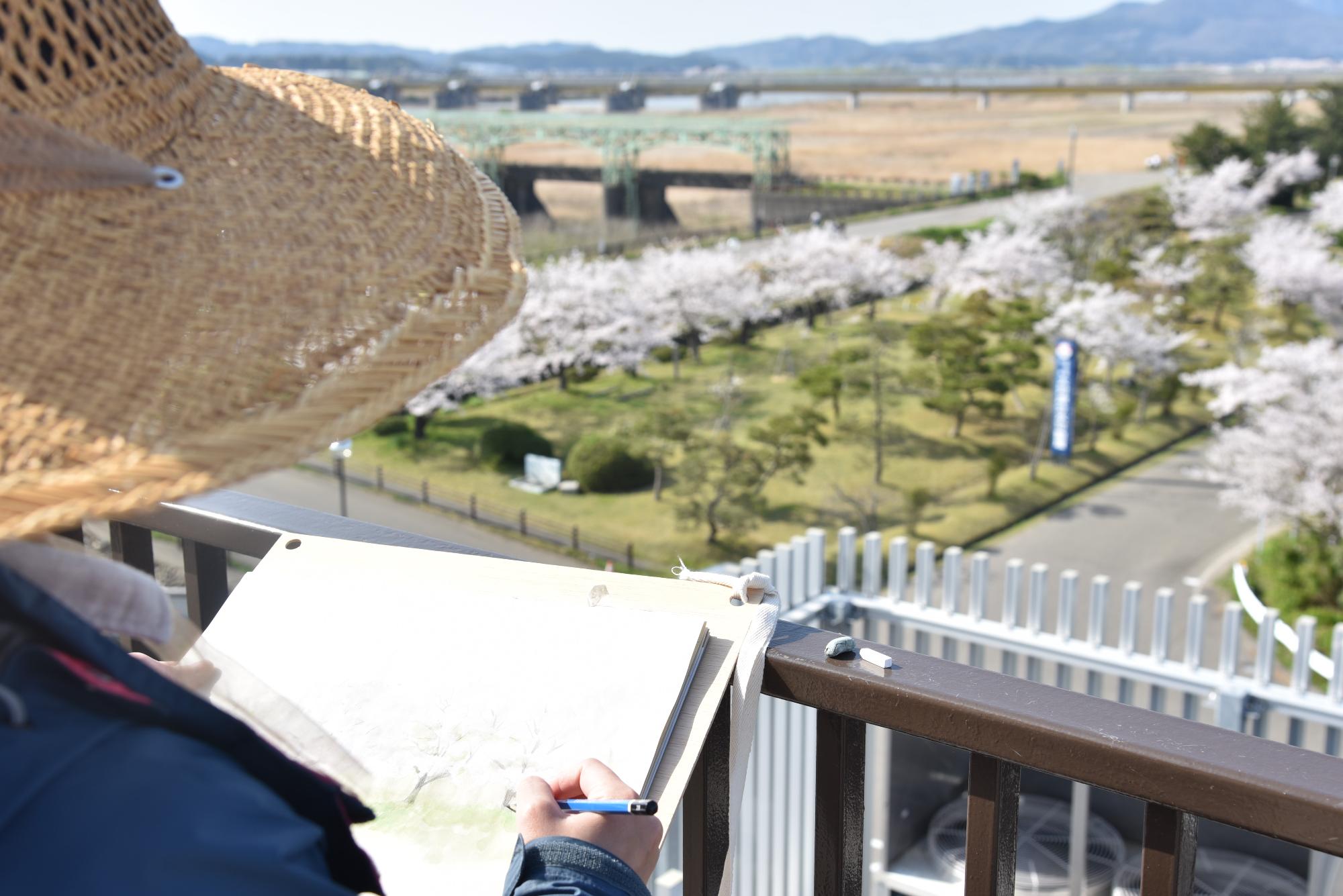 美しい桜並木もご覧ください。中にはスケッチを楽しんでいる人も!