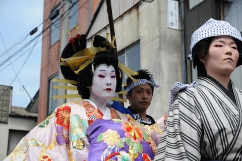 正午からは、いよいよ行列が地蔵堂本町通りを練り歩きます。「信濃太夫」「桜太夫」「分水太夫」の3人のおいらんと約60人の付き人が織りなす時代絵巻さながらの夢道中が観光客を魅了しました。